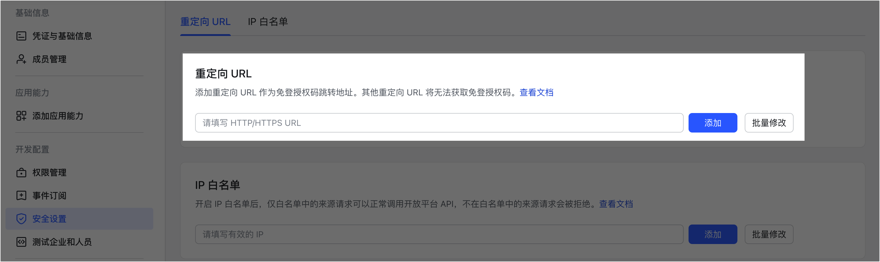 - 在 开发配置 > 安全设置 页面,配置重定向 URL。你需要将实际发起 API 请求的服务端公网地址配置为应用的重定向 URL。重定向 URL 支持配置多个,只有在重定向 URL 列表中的 URL 在请求时才会通过开放平台的安全校验。