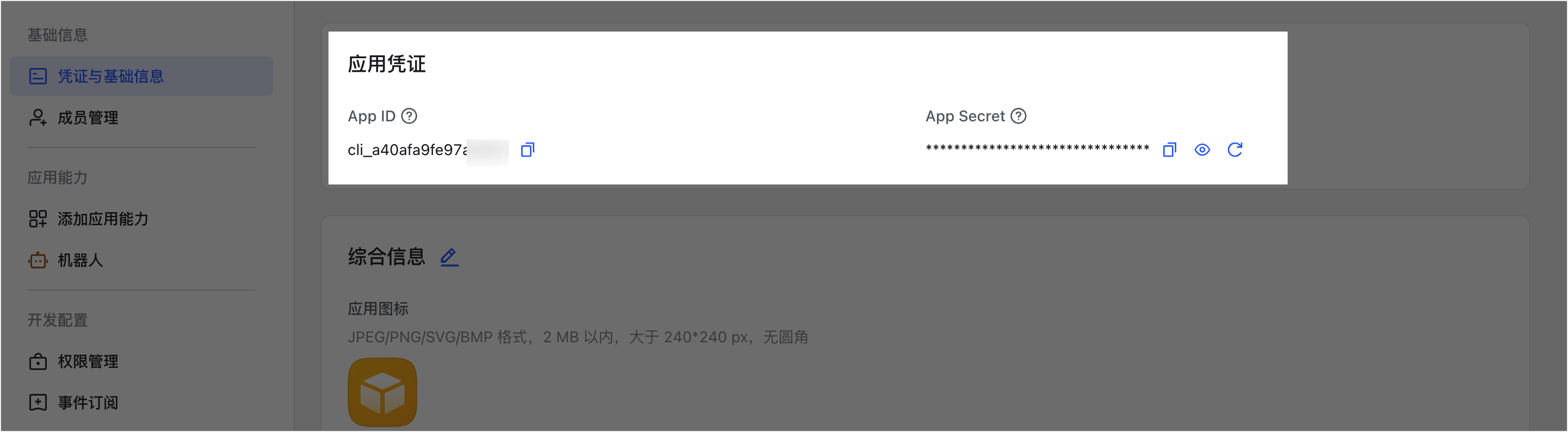 - 在 基础信息 > 凭证与基础信息 页面,获取应用凭证 App ID 和 App Secret。