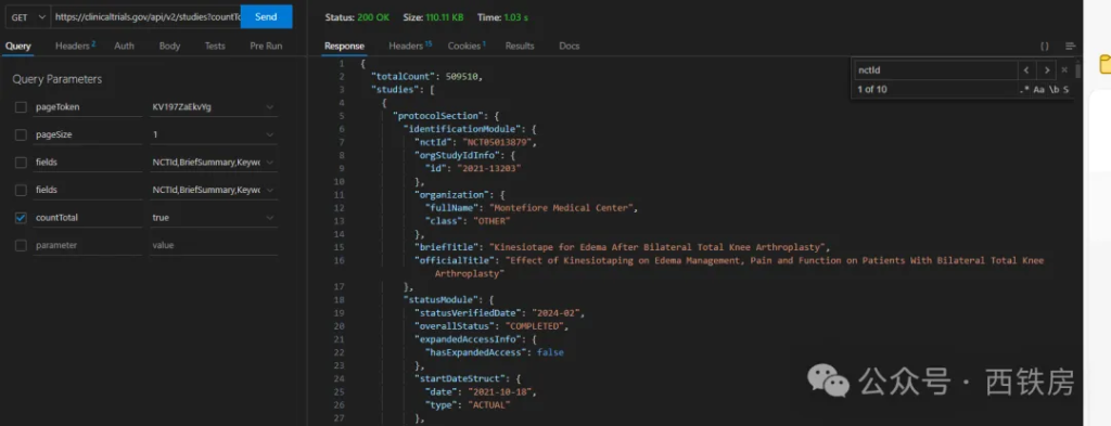 ?pageToken=KV1-7ZuCkPYg&countTotal=true有关更多查询参数设置,可参考官方链接 API 介绍:https://clinicaltrials.gov/data-api/api