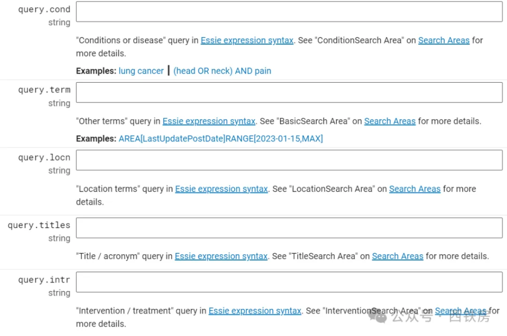 | /studies/search-areas | 用来获取构建复杂查询的字段及其权重信息,详情请参见:https://clinicaltrials.gov/data-api/about-api/search-areas |