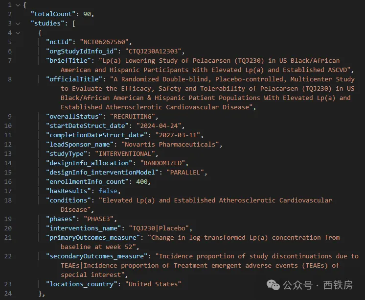 CT.gov API 提供了非常丰富的数据接口和参数供用户选择使用。在某些情况下,我们为方便调用和集成,也可以考虑对原生 API 进行二次封装,比如下图所示,只返回部分指定感兴趣内容,并取消了原 API 返回数据的多层级信息结构, 返回结果更加直观,一目了然。