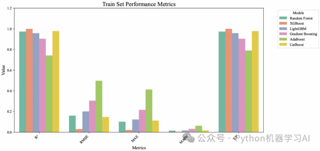 和 CatBoost),分别在训练集和测试集上评估单一模型的预测性能,通过计算 R^2、RMSE、MAE、MAPE 和解释方差等指标,为单一模型提供基准性能,用于对比 Stacking 模型是否通过融合多模型的优势显著提升了预测精度和稳定性,接下来对这些评价指标进行一个简单的可视化。