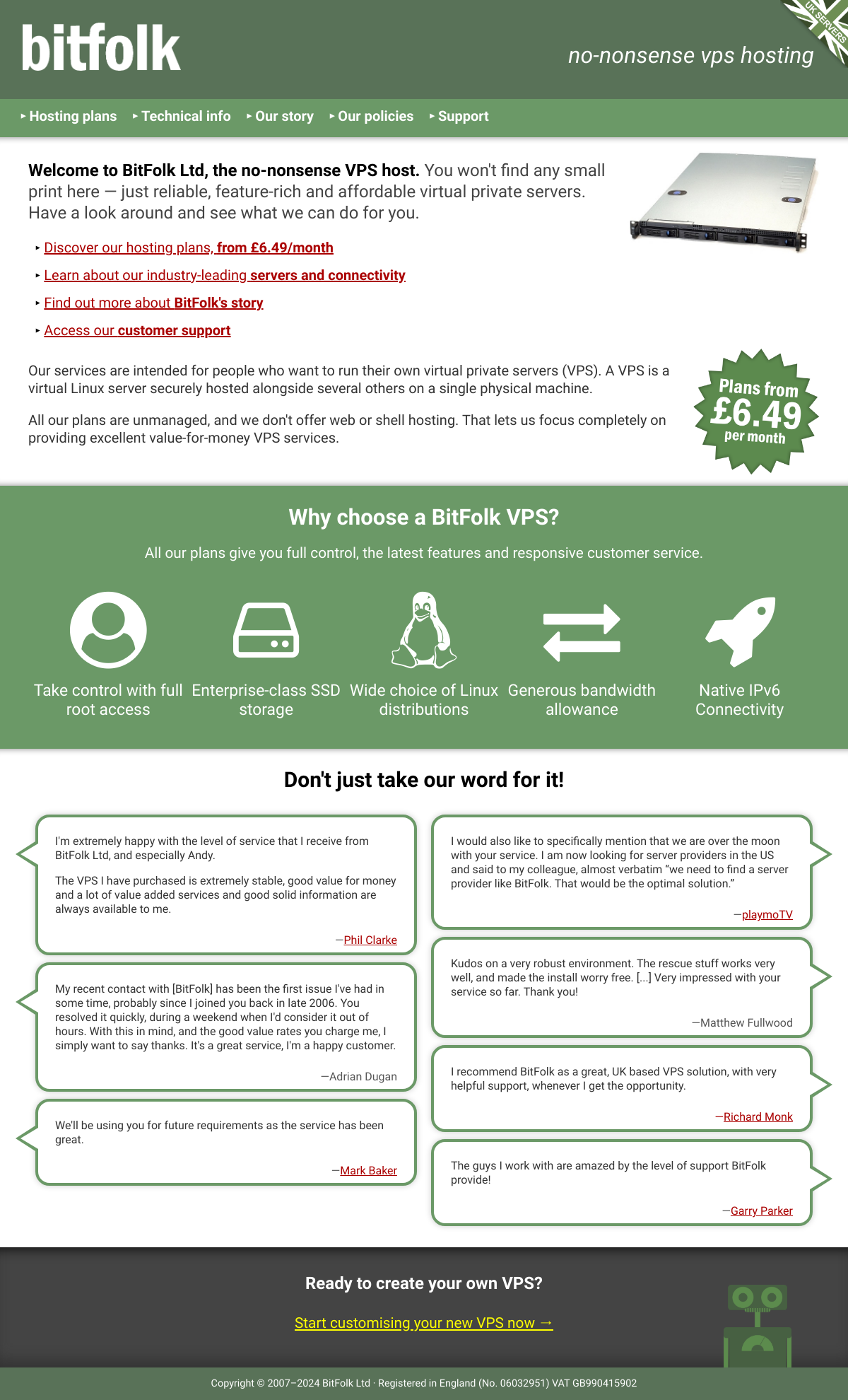 更多BitFolk Ltd是一家提供无废话的虚拟私人服务器(VPS)托管服务的公司,专注于为需要运行自己VPS的客户服务。公司提供可靠、功能丰富且价格合理的VPS,包括完全控制权、企业级SSD存储、多种Linux发行版选择、慷慨的带宽配额和原生IPv6连接。