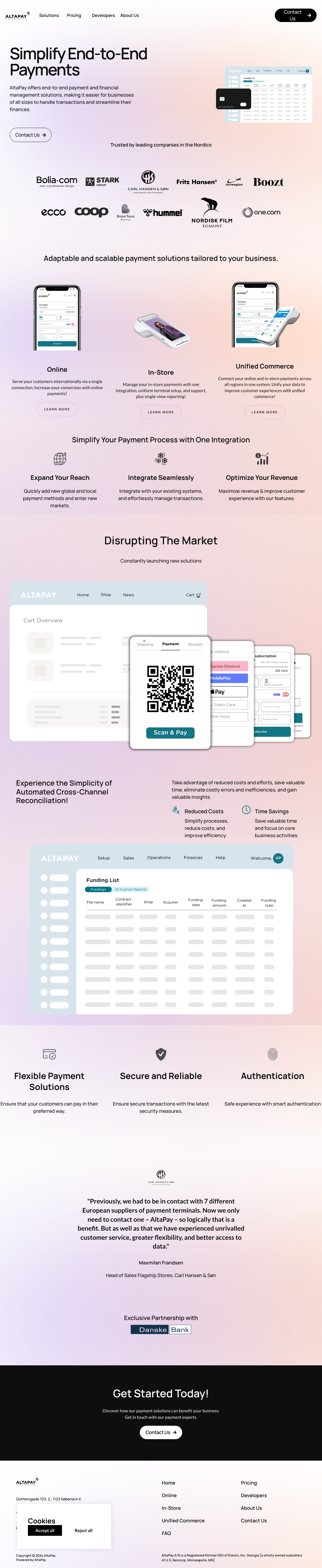 更多AltaPay是一家提供端到端支付和财务管理解决方案的服务提供商,旨在简化各种规模企业的交易处理和财务流程。公司提供在线支付、店内支付和统一商务解决方案,支持全球和本地支付方式,帮助企业扩展市场并优化收入。AltaPay强调自动化跨渠道对账的简化性,减少成本和时间消耗,同时确保交易的安全性和可靠性。