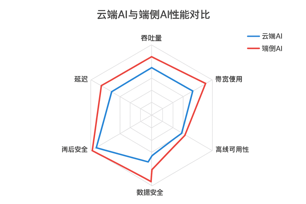 图3:云端AI与端侧AI性能对比雷达图(设计意图:从多个维度对比两种方案的优劣;关键配置:选择5个关键性能指标进行对比;可观测指标:各维度得分值,面积大小代表综合性能)