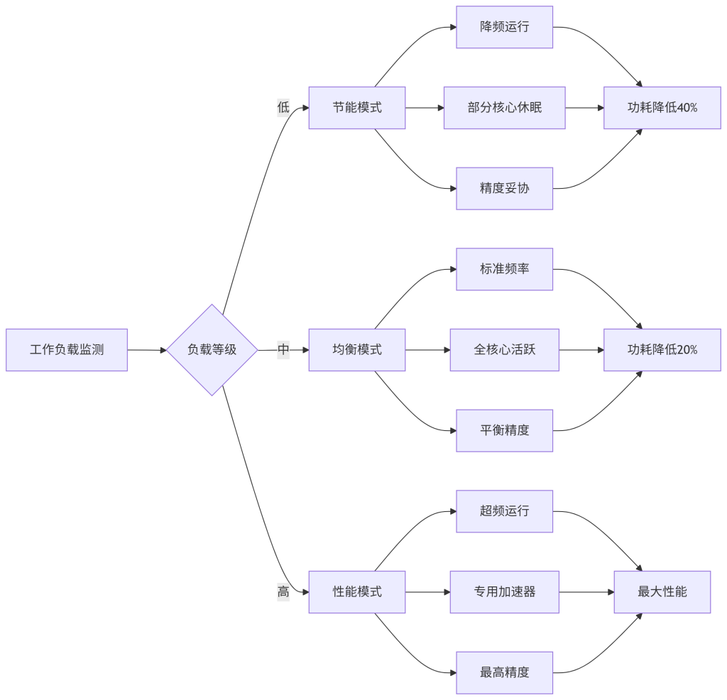 图4:动态功耗管理策略(设计意图:展示根据不同工作负载自动调整功耗的策略;关键配置:三种工作模式及其触发条件;可观测指标:功耗降低百分比、性能损失比例)
