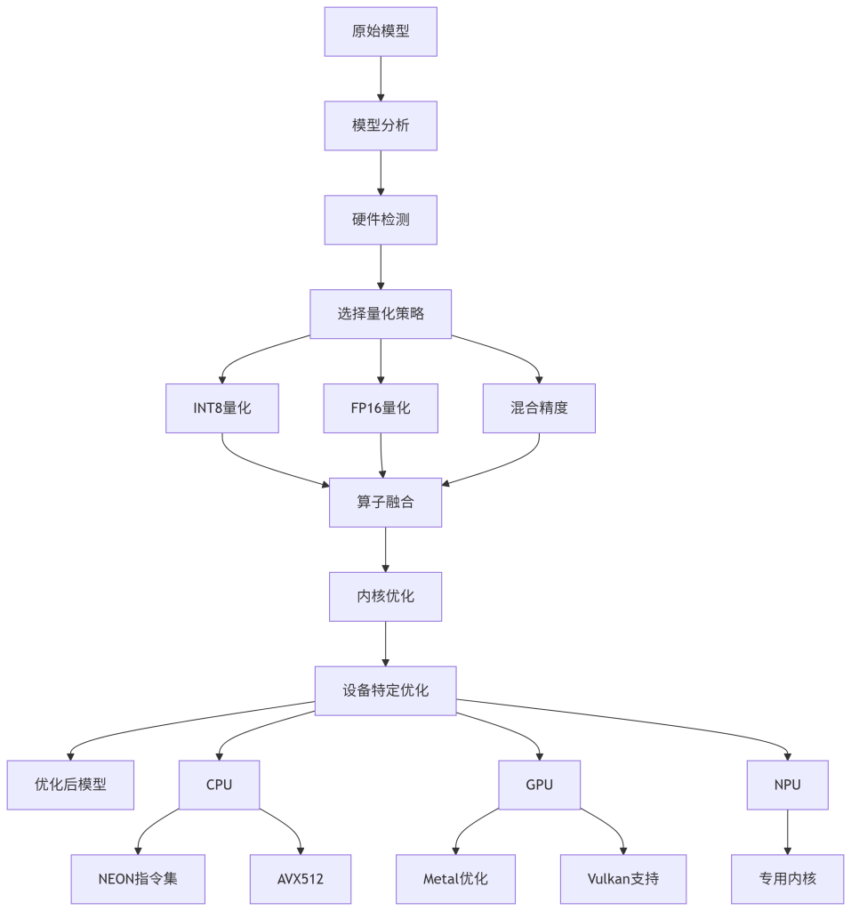 图2:自动模型优化流水线(设计意图:展示模型从原始状态到设备优化版本的自动化流程;关键配置:量化策略选择、硬件特定优化路径;可观测指标:模型大小减少比例、推理速度提升比例)