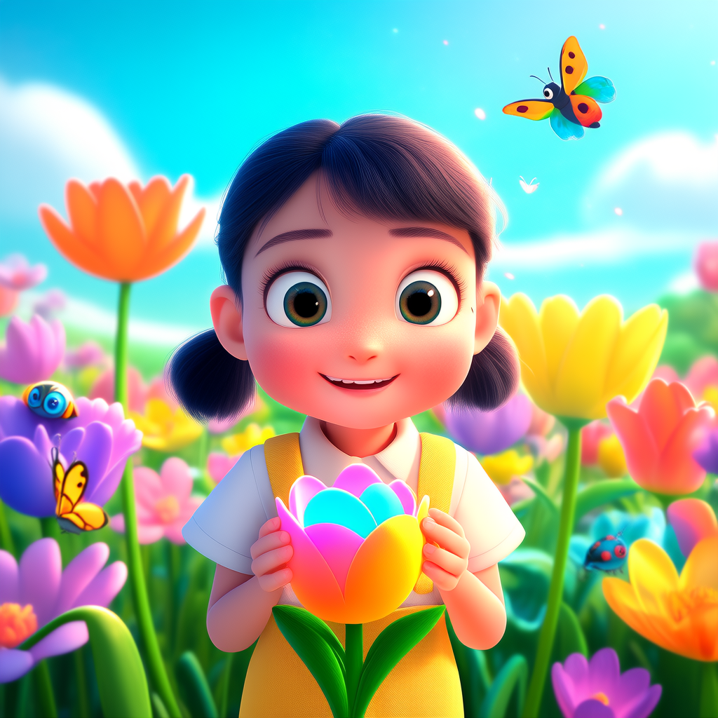 输出内容:工具生成了一幅充满皮克斯动画质感的场景图,主角“小悦”置身于梦幻的草原中。