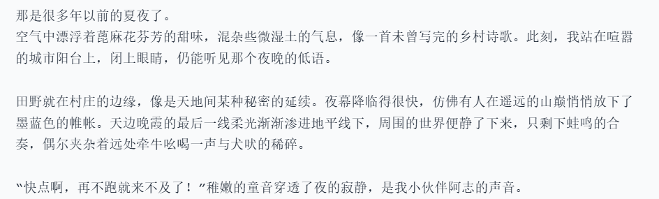 这个提示词能帮助你生成富有画面感的旅行叙事。通过场景描写、人物对话和感官细节,让“风景”转化为故事,轻松打造适合图文视频结合的内容。