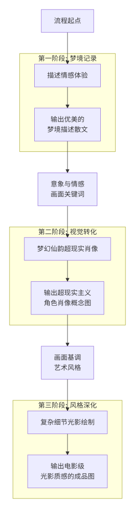 看,艺术创作并非专业画师的专利。这个结构化的AI工作流,将抽象的梦境与情感,通过层层递进的加工,转化为具象而震撼的视觉艺术。它尊重并放大了你的原始创意,并充当了最高效的执行伙伴。无论你是想记录私人梦境,还是为你的故事书寻找插图,或是 simply 探索超现实艺术的魅力,这个流程都能为你打开一扇新世界的大门。现在就尝试这个流程,让你下一次醒来时的朦胧记忆,变成一幅值得珍藏的视觉奇迹吧!✨