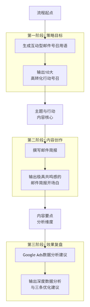看,执行一次数据驱动、内容专业、转化率高的邮件营销活动,并不一定需要捆绑于某个特定的营销平台。这个结构化的 Nowprompt AI工作流,将邮件营销的核心环节——策略、内容、分析——抽象为三个清晰的步骤,让AI在每一步都成为你的得力助手。它让你能像增长专家一样思考,像文案高手一样创作,像数据分析师一样洞察。现在就尝试这个流程,让你下一封营销邮件,成为推动业务的强大引擎吧!🚀