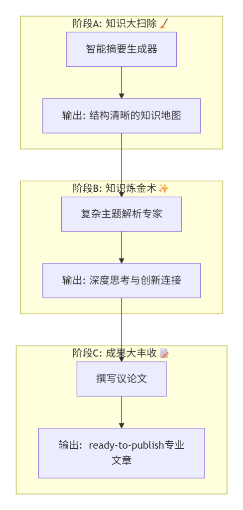 流程图解读:就像工厂流水线一样,你的“知识原材料”从A端进入,经过三个车间的精密加工,最终从C端产出的就是闪闪发光的“知识产品”!