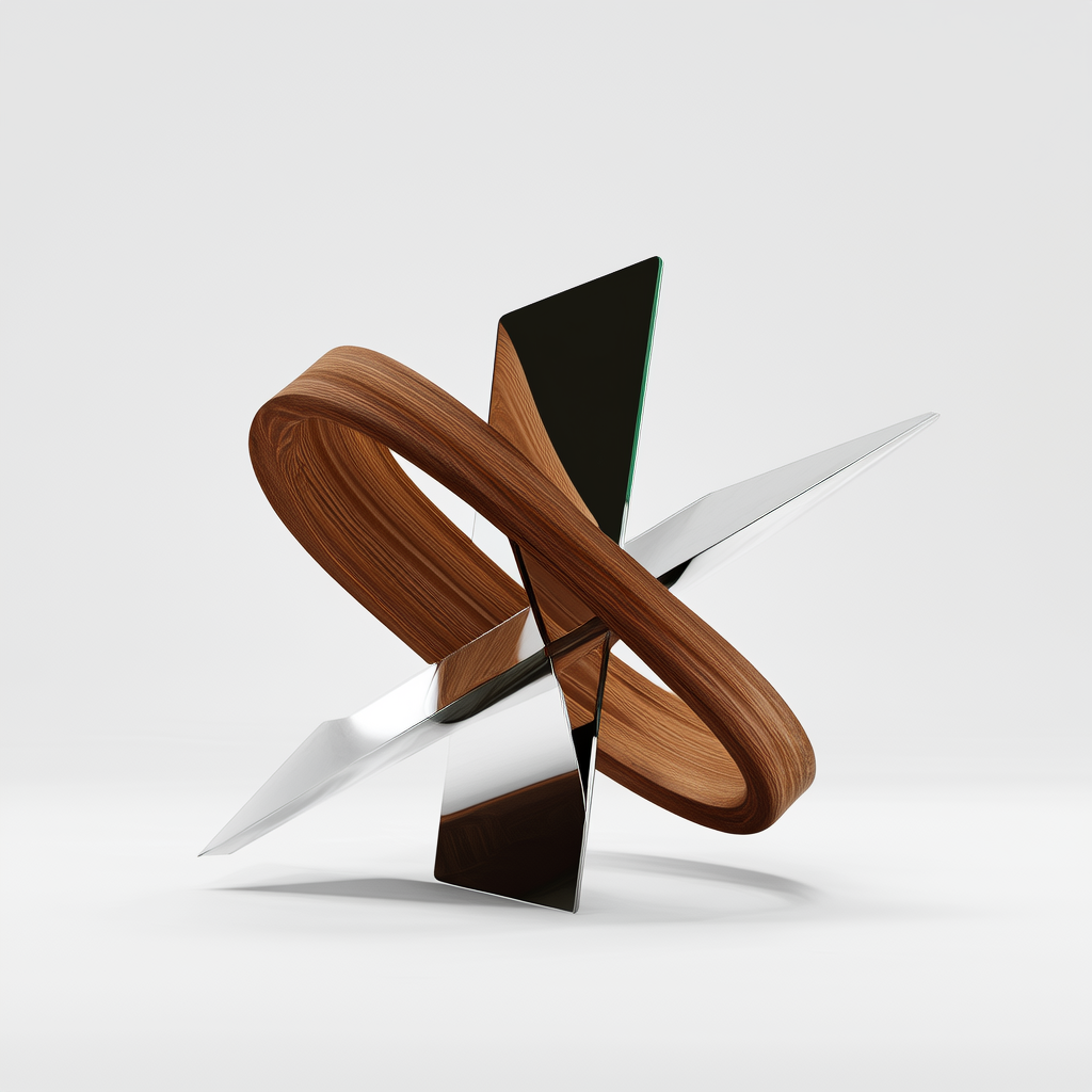"雕塑材质": "破碎的镜面与温暖的木质",