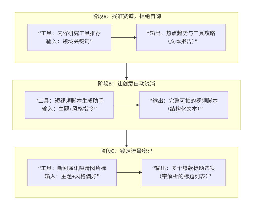 流程图说明:这套流程模拟了专业内容团队的核心工作,但全部由AI高效完成。我们先用内容研究工具摸清“2024网红美食趋势”,找到创作方向;再用脚本生成器,把方向变成一份“轻松幽默的探店脚本”;最后用标题生成器,为成品提炼出“夸张有趣”的流量钩子,形成完美闭环。