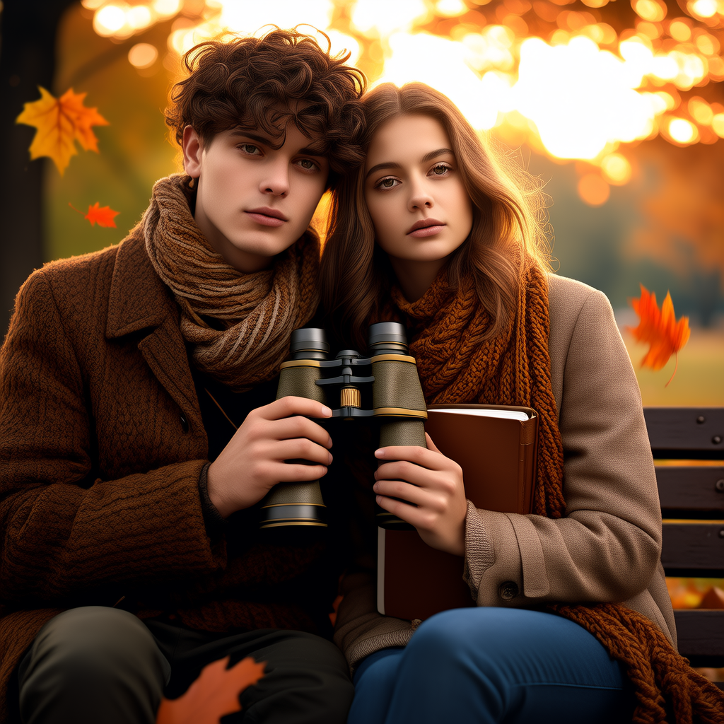 工具生成了一张(或一组)唯美的人物肖像概念图。图中,身着秋冬装、围着围巾的男女主角坐在公园长椅上,周围是纷飞的落叶,黄昏的暖色调光线烘托出温暖、怀旧又带一丝感伤的氛围,完美契合了剧本中的情感基调。