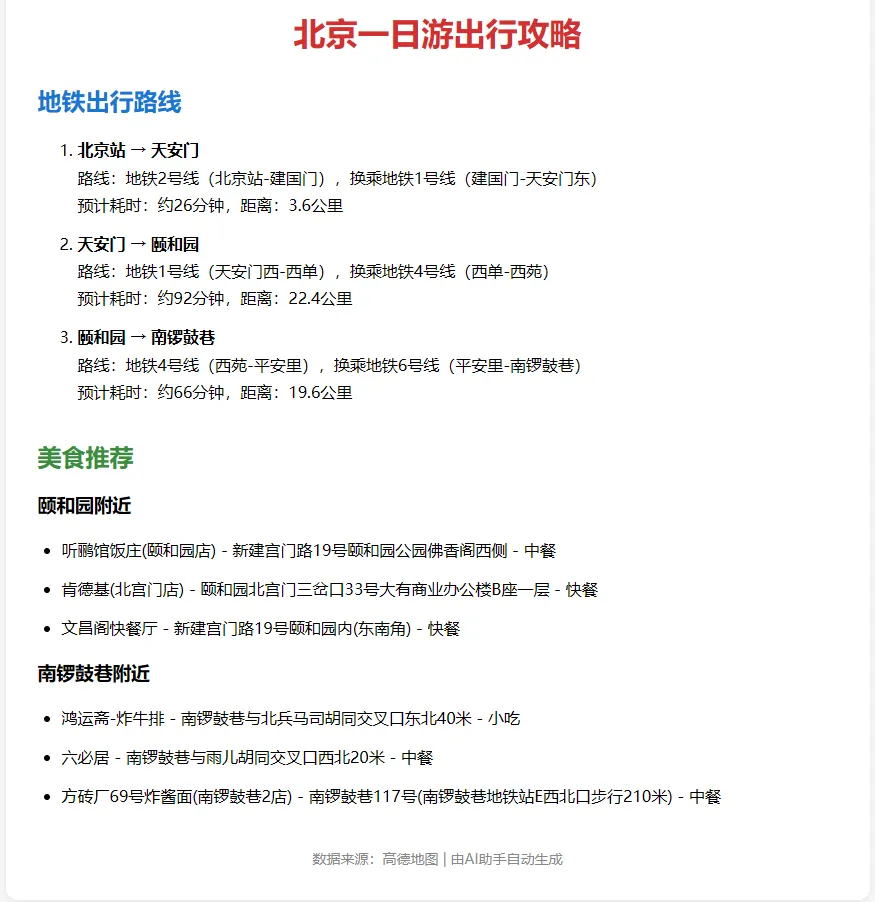 1、从高德地图的MCP服务中获取北京站到天安门、天安门到颐和园、颐和园到南锣鼓巷