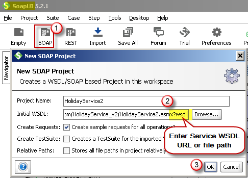 - 打开 SoapUI,点击“SOAP”创建新项目。