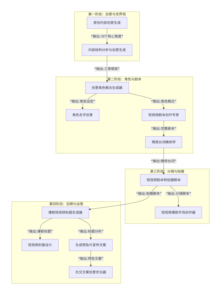 | 分镜与拍摄 | 短视频剧本转拍摄脚本 | 定稿剧本(含最终台词) | 详细分镜脚本、拍摄参数 |