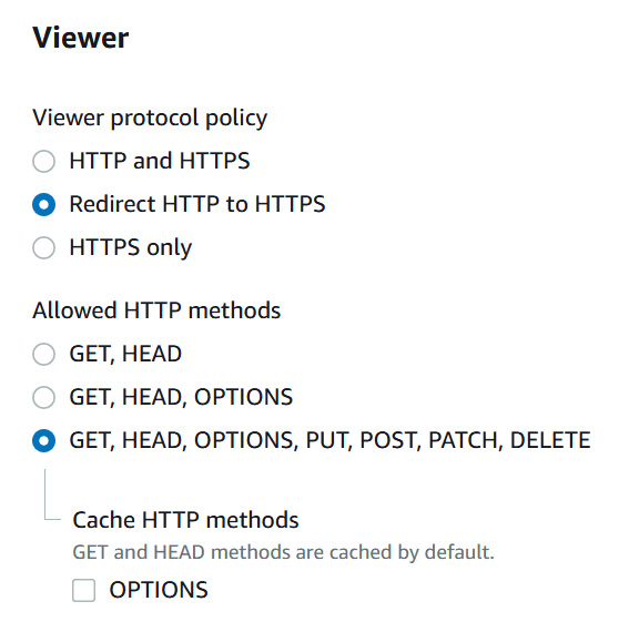 - 设置查看器协议策略:选择“将 HTTP 重定向到 HTTPS”,允许的 HTTP 方法选择“GET, HEAD, OPTIONS, PUT, POST, PATCH, DELETE”。