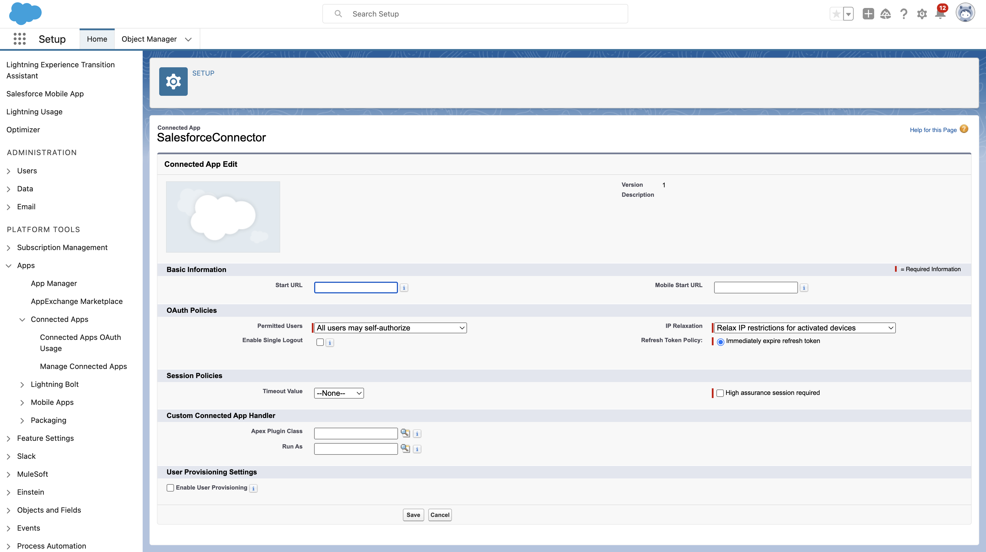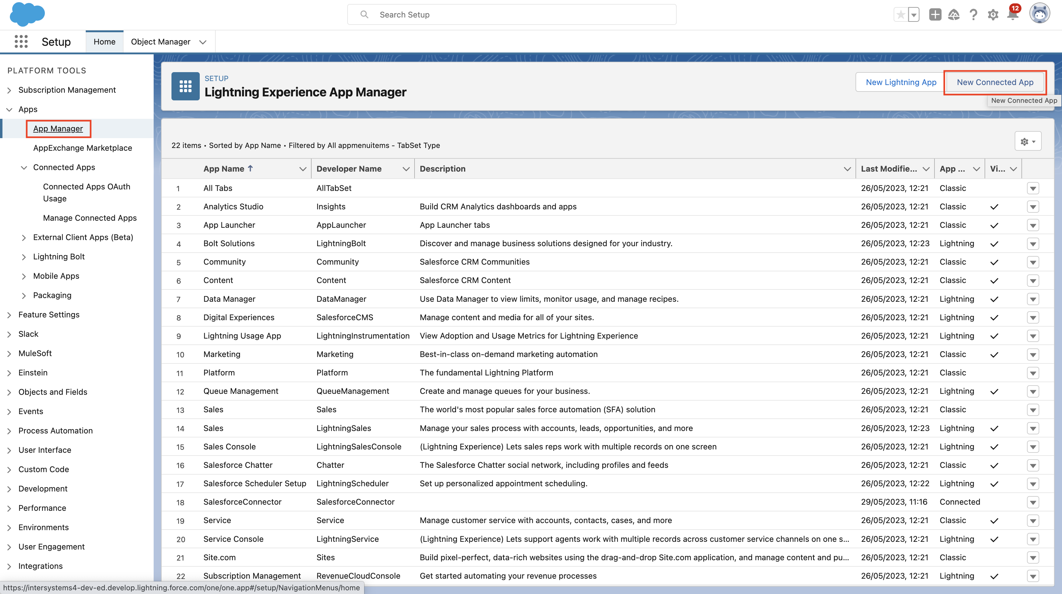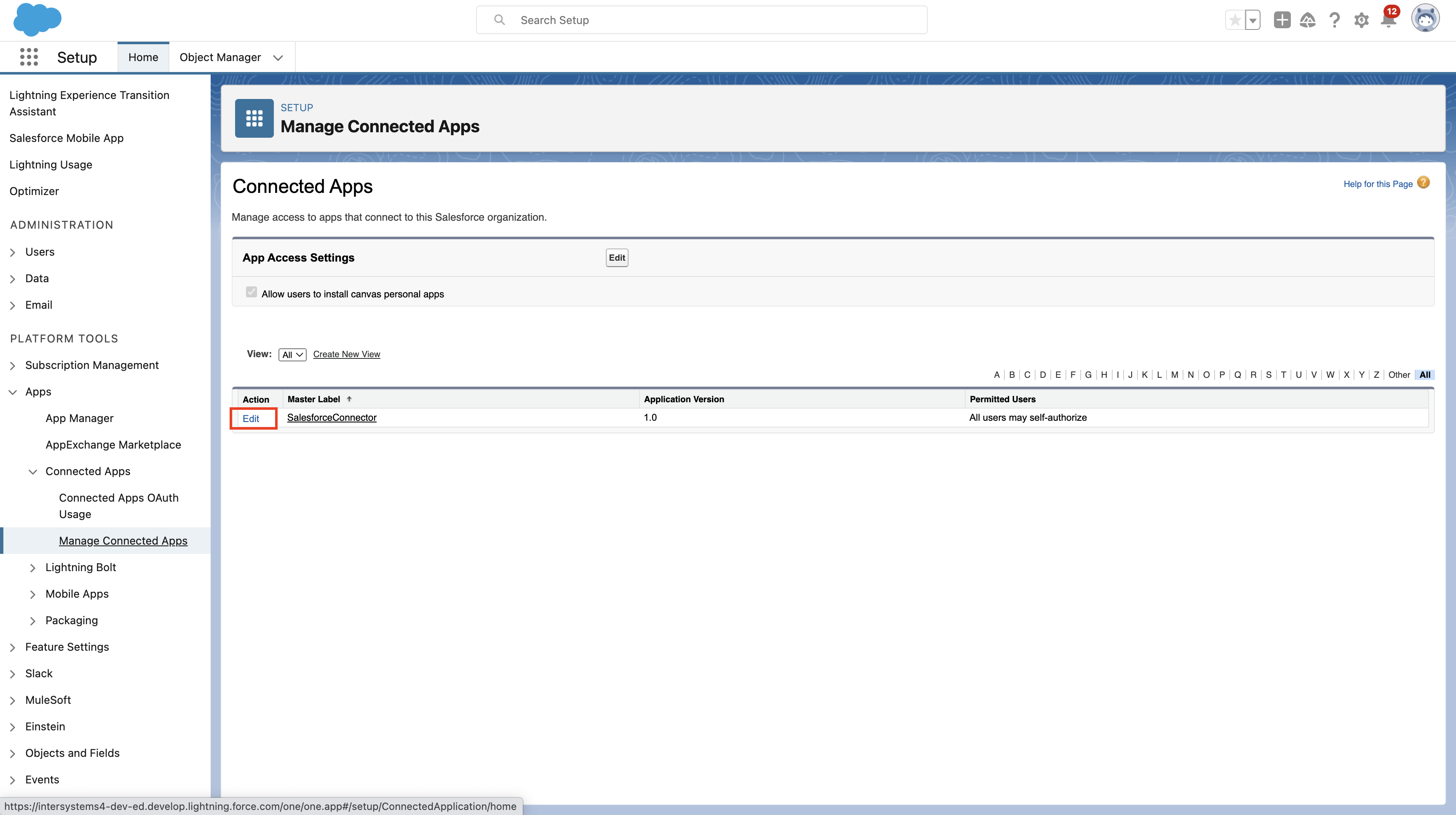 进入安装程序 -> 平台工具 -> 应用程序 -> 连接的应用程序 -> 管理连接的应用程序