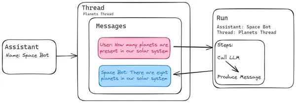 - 运行助手:根据线程中的消息,助手调用 OpenAI LLM 生成适当的响应,并可能使用相关工具。