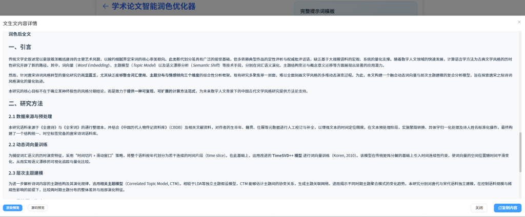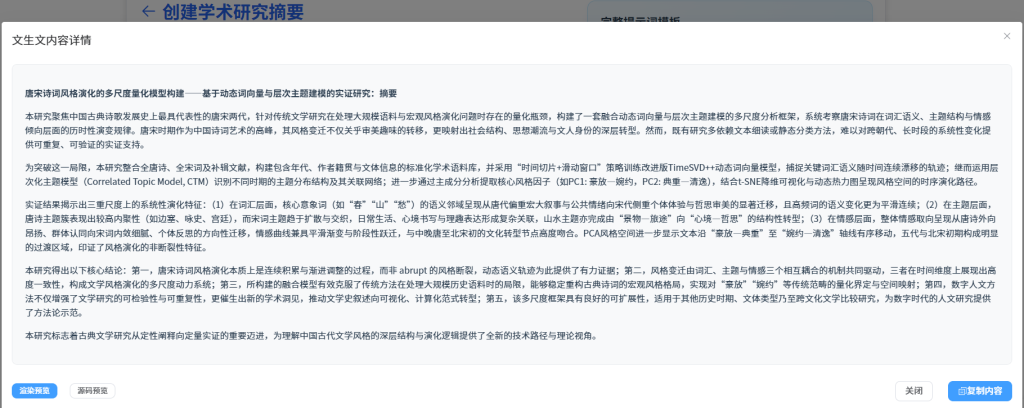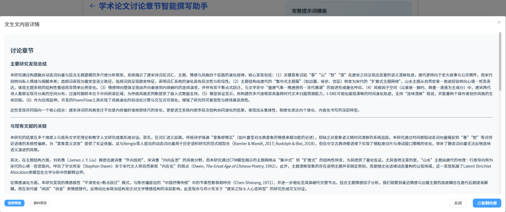 唐宋时期是中国诗词艺术最为繁盛、风格最为多样的时代,其文学表达在主题取向、词汇选择、意象组合以及情感结构上呈现出显著的阶段性与系统性差异。传统文学研究往往依赖文本细读、文史互证或风格学分类,对宏观风格演化的趋势具有深刻洞察,但在处理涉及 大规模语料、跨朝代比较、语义层级变动 等问题时,仍存在难以量化验证的瓶颈。尤其是在探讨唐宋诗词如何在 词汇层面(lexical semantics)、主题层面(topic structures)与情感层面(affective patterns) 出现系统性演变时,传统方法难以提供可重复、可检验的证据链。
