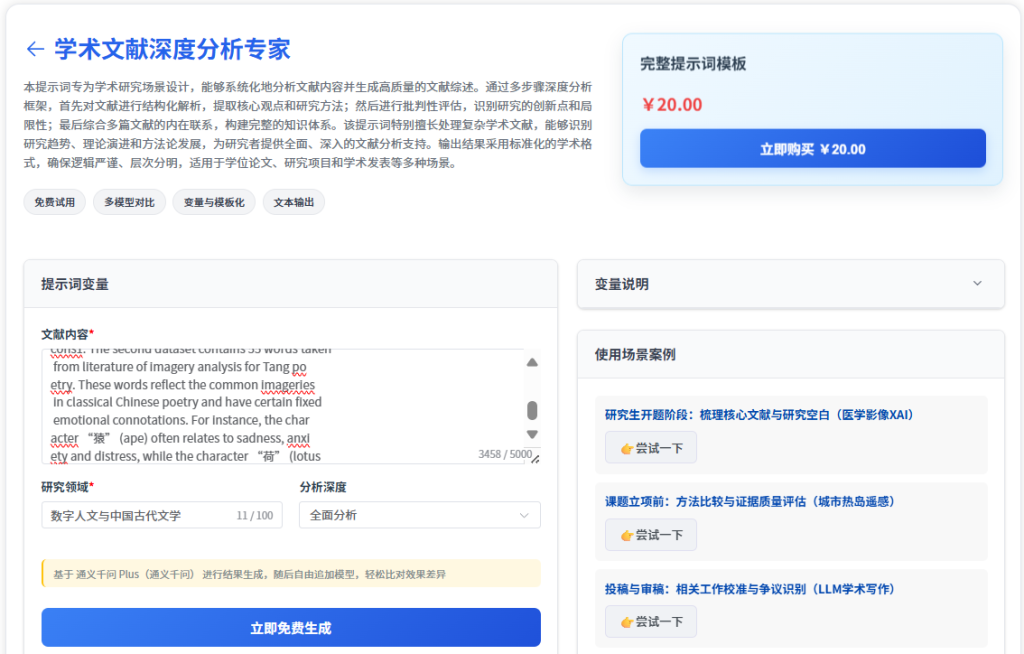 当你需要撰写正式的文献综述时,它是你的"联合撰稿人"。将多篇核心文献同时交给它,它能进行交叉对比、批判性分析,并生成一个结构完整、逻辑严谨的文献综述章节初稿。