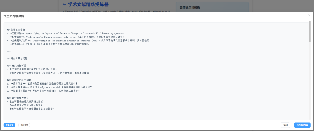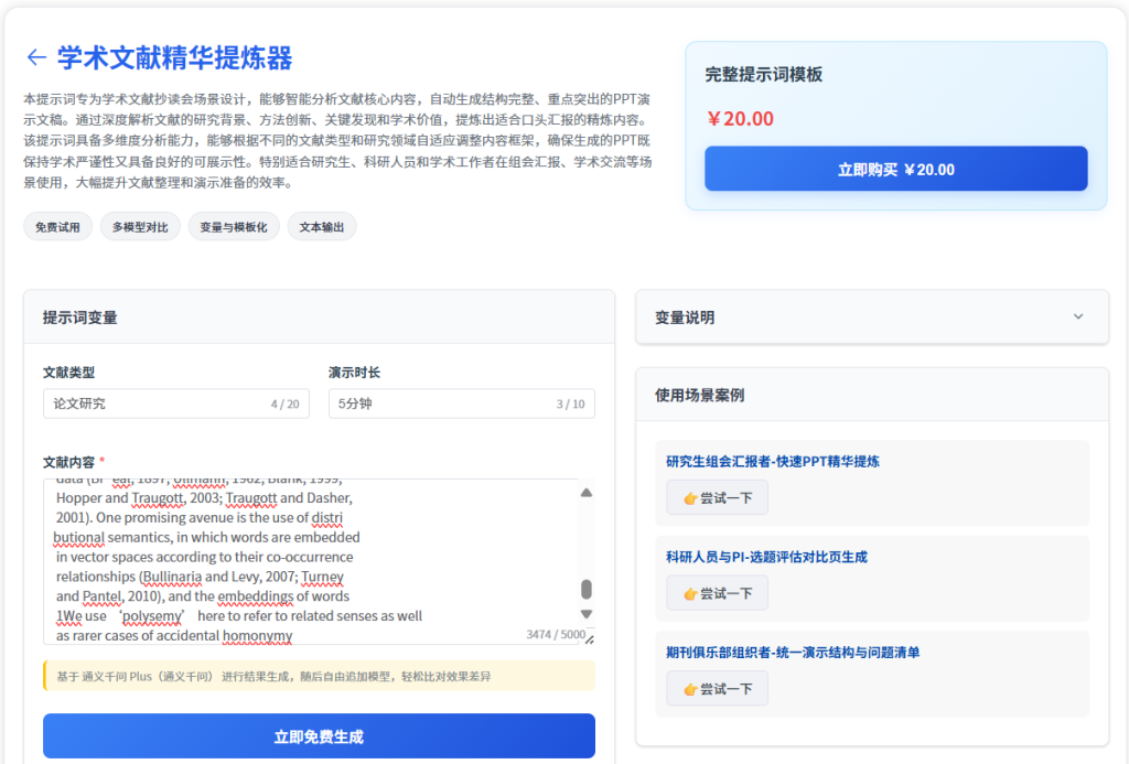 当你有十几篇PDF待读时,它是你的"速读助理"。它能快速解析单篇文献,生成包含研究背景、方法、发现和价值的精炼摘要或PPT大纲,让你一小时掌握十篇文献的精华。