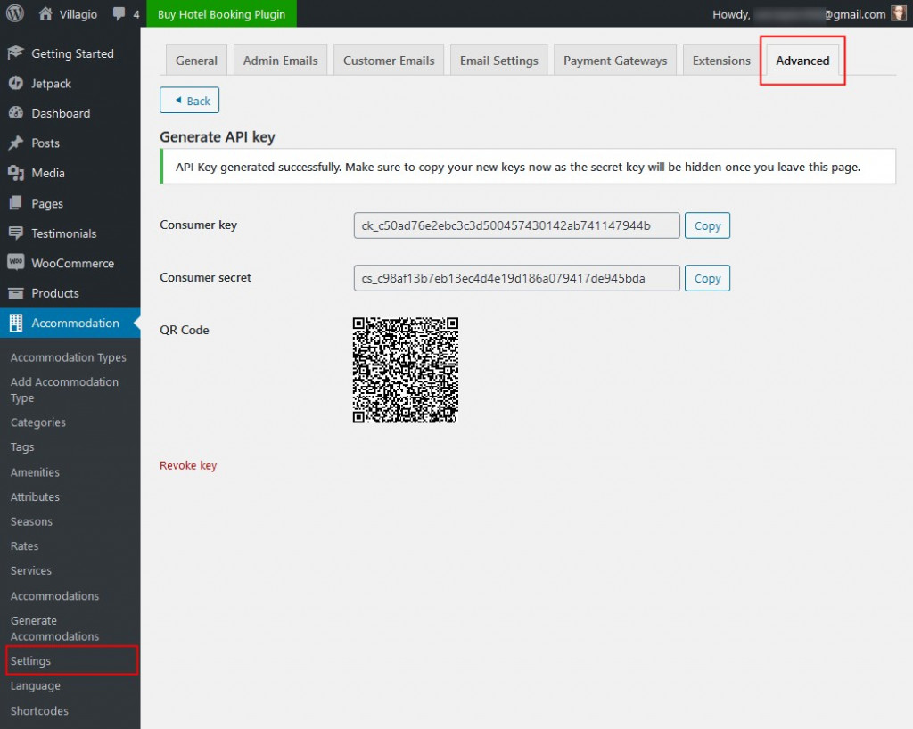 → 在 WP 后台 Hotel Booking → Settings → REST API 点击 Add Key,选择用户并赋予 read/write 权限。