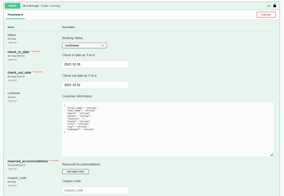 使用 POST 方法对 /bookings 端点发送请求,可以创建一个新的住宿预订。