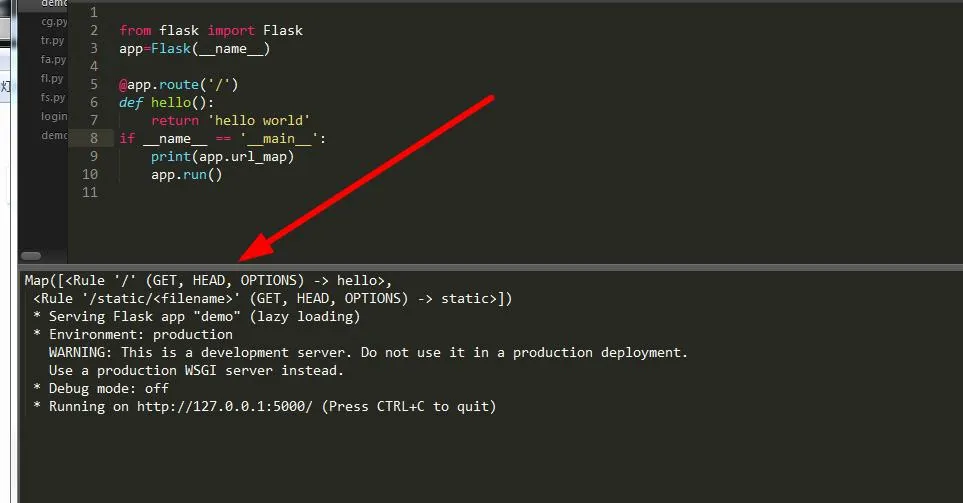 url_map存储的是url与endpoint的映射。那么这个endpoint是什么意思了?实际上,当请求传来一个url的时候,会先通过rule找到endpoint,然后再根据endpoint再找到对应的视图函数。通常,endpoint的名字都和视图函数名一样。这里还有一点特别注意,那就是所有的控制台输出信息语句必须写在app.run()之前,否则不起作用。