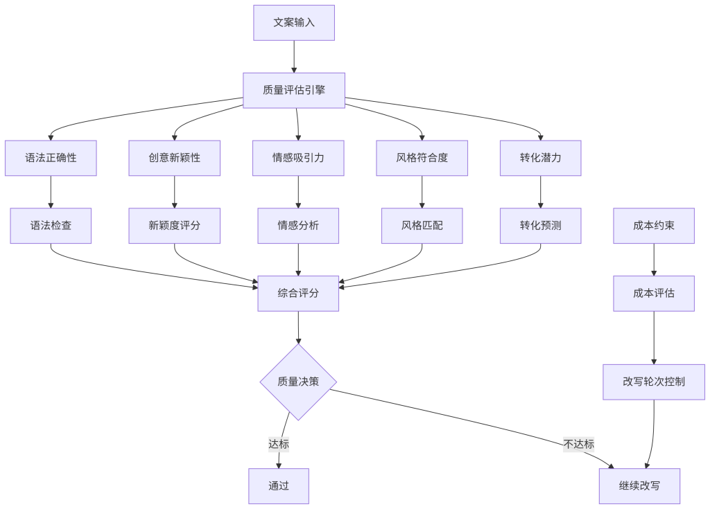 设计意图:构建全面质量评估体系,在成本约束下确保文案质量。