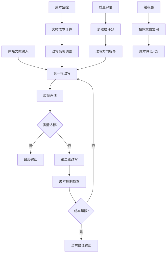 设计意图:构建智能迭代改写流水线,在成本约束下追求最优文案质量。