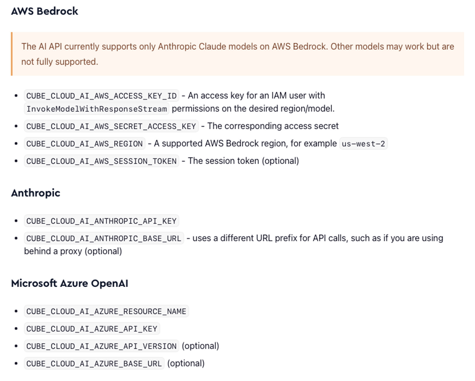 Cube Cloud客户现在可以选择 自定义LLM 与 AI API 结合使用,从而降低成本或满足特定安全需求。与其仅按“每5个请求=1个CCU”的方式计费,客户可以通过自定义LLM生成成本,从而更灵活地控制支出。