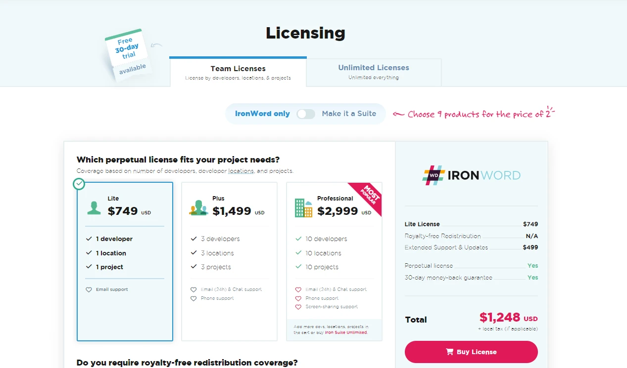 IronWord 提供多种许可方案,以满足不同规模团队的需求。