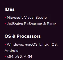 IronWord 支持主流的集成开发环境(IDE),如 Microsoft Visual Studio、ReSharper 和 Rider。同时,它兼容多种操作系统和处理器架构(x64、x86、ARM),确保在不同硬件配置下的高效运行。