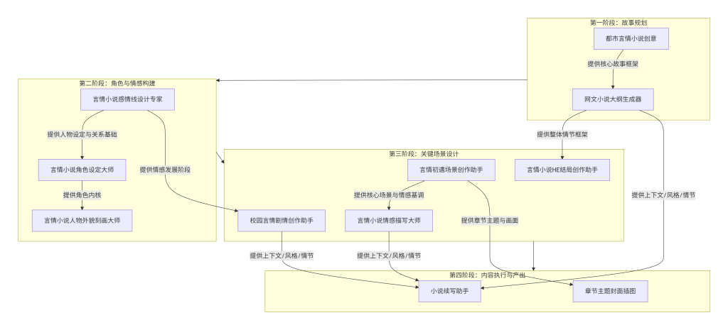 | 规划 | 都市言情小说创意 | 生成多套差异化的完整故事方向 | 核心元素、风格偏好、情感强度 |