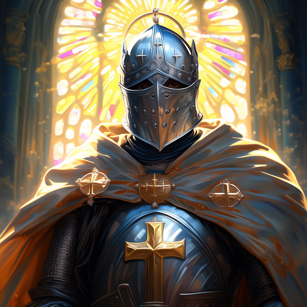 "光影效果": "神圣的顶光,仿佛来自天堂,背景有模糊的教堂彩窗"