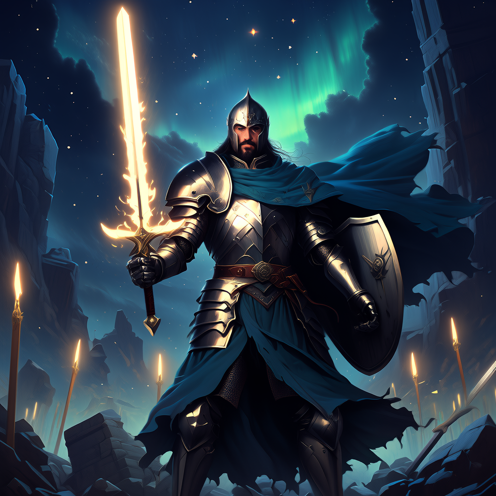 工具生成了一个震撼的战场场景,圣骑士手持发光圣剑屹立在古老战场的废墟中,眼神坚定地望向远方,夜空背景下透出的神圣光柱与角色的神圣气质完美呼应,营造出史诗般的战争氛围!