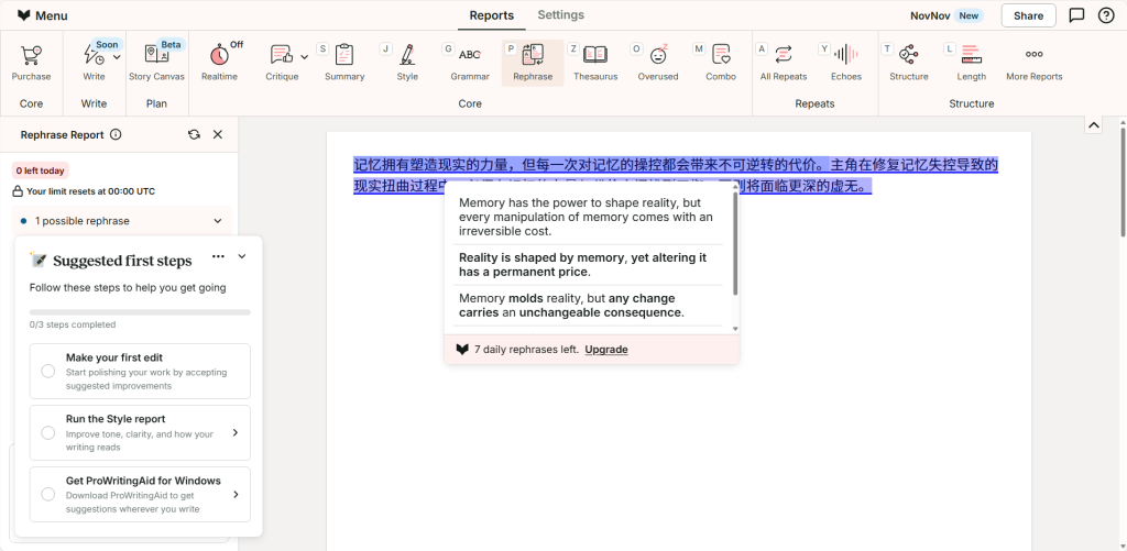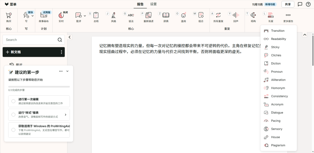 而 ProWritingAid 在“从 0 到 1”上无能为力。失望像深夜的寒意,包裹着我:难道中文创作者的宿命就是这样吗?