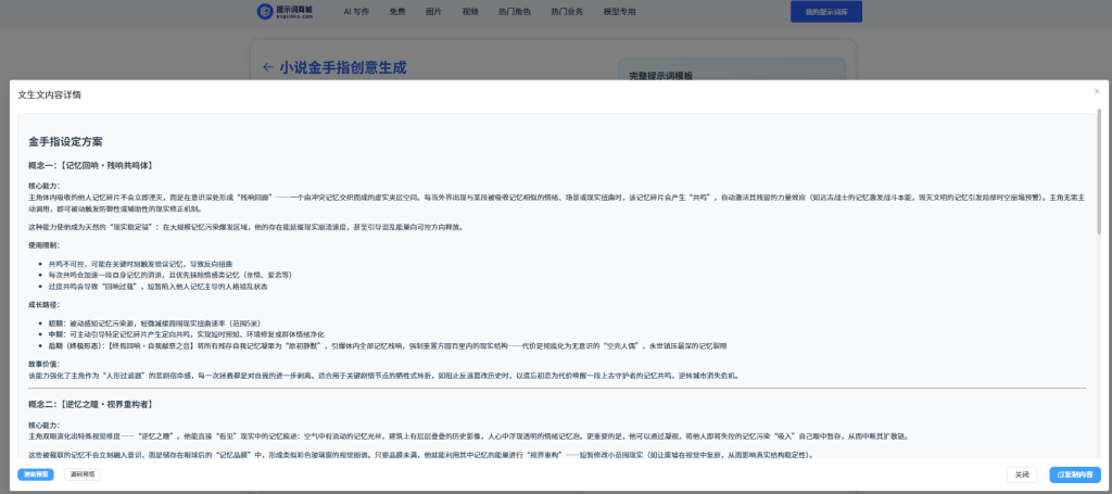 就在我准备合上电脑拥抱绝望时,想起一位网文大神朋友曾安利过 Nowprompt(提示词库)。我立马试用——结果证明,这是我创作路上的翻盘工具。重要说明:我是完全免费试用就完成了这部小说的世界观与初稿构建,实际上没有花钱。(当然,如果你想把提示词个性化调整,可以一次性买断某些提示词并把提示词指令下载下来离线使用——无订阅套路,按需买断即可。)