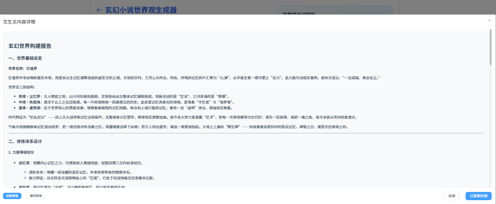 我颤抖着点开,也就填了几个关键词、选了风格,点“免费生成”。几秒后,一个名为「忆墟界」的完整世界观砸在我脸上:记忆即现实、操控必付代价、各方势力盘踞……细节多到能直接开写。效率比我自个儿冥思苦想快一万倍。
