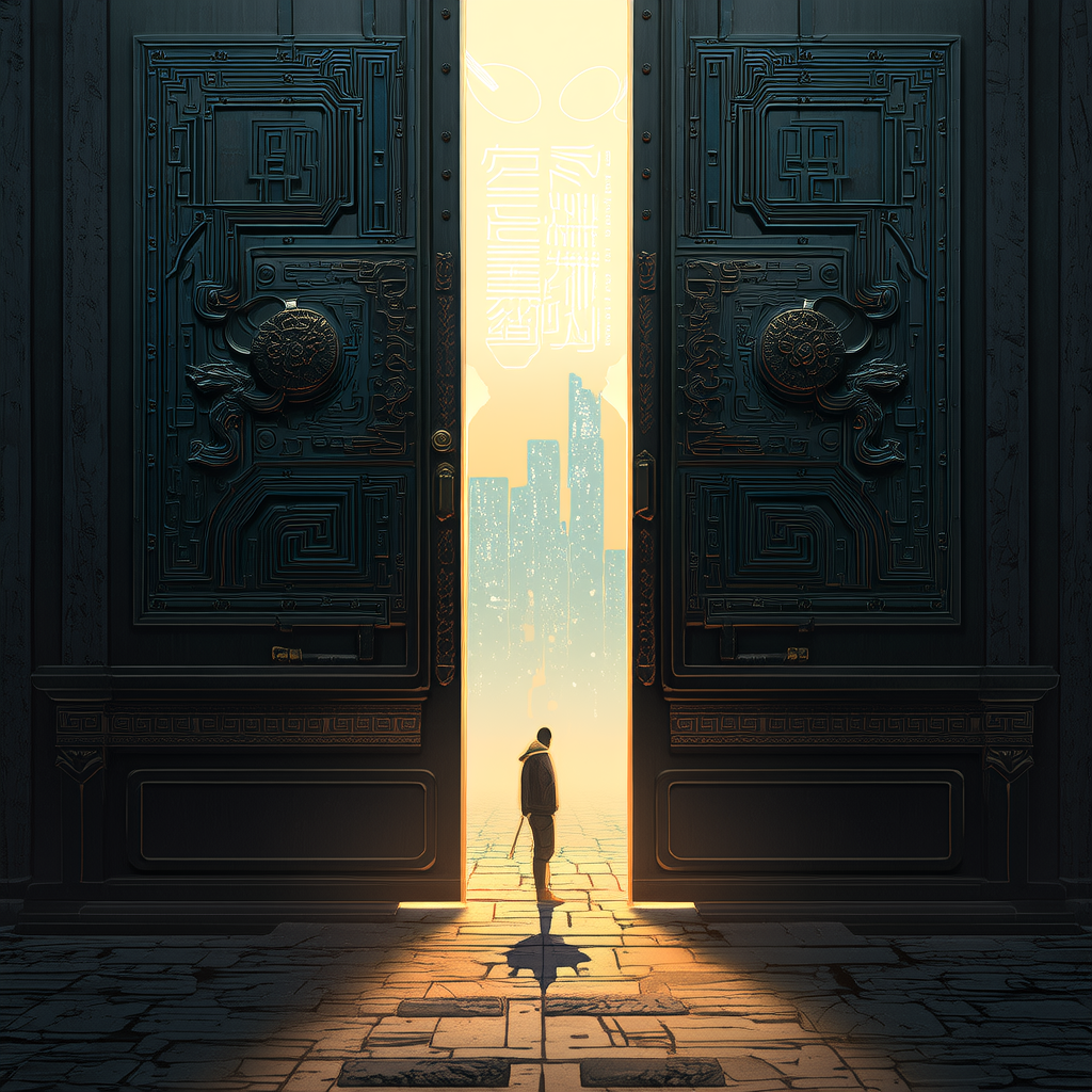 背景描述:画面中央是一扇微微开启的、刻有复杂纹路的青铜色巨门,门缝中透出温暖而深邃的光芒。门前的地面上,投射出一个正在修复文物的、孤独的人影。远处,隐约可见现代城市的轮廓,空中漂浮着一些由光线构成的、如同古代文字的抽象符号。