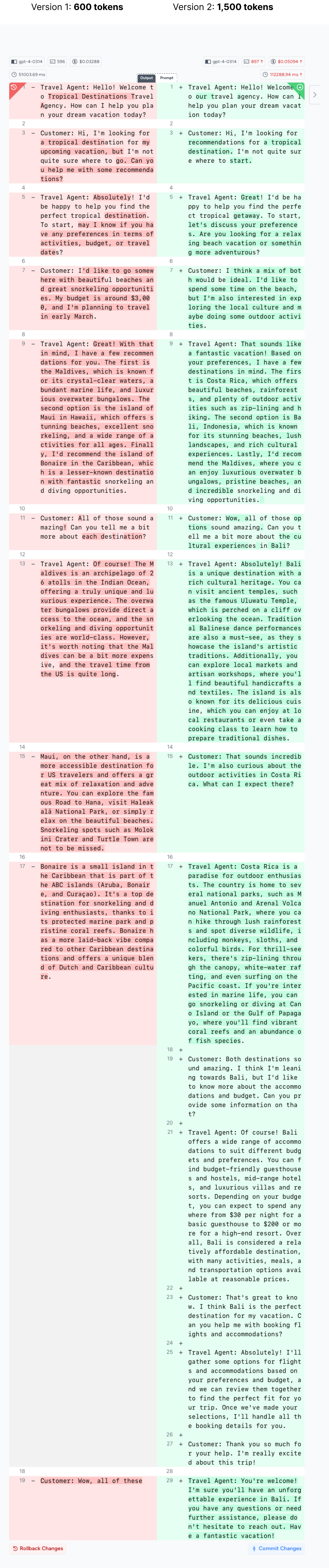 结果显示,版本1的响应更简洁,处理速度更快;而版本2则提供了更详细的建议,包括目的地的文化体验、预算等信息。这表明,不同的代币限制适用于不同的用例。