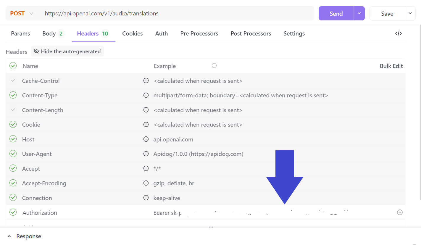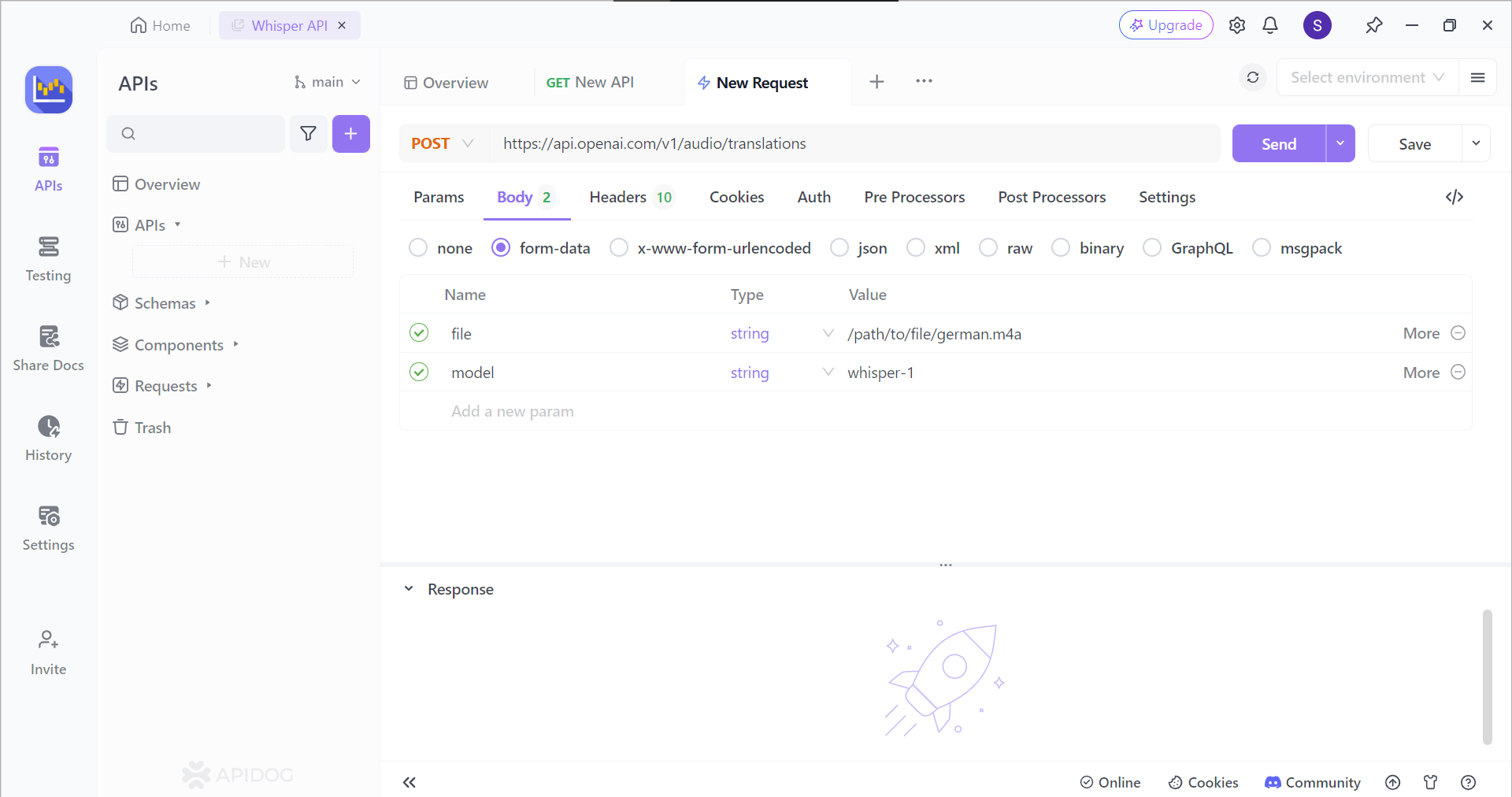 以下是通过 Apidog 使用 Whisper API 将语音转换为文本的简单操作指南。在开始之前,请确保您已获取 OpenAI API 密钥,这是使用 Whisper API 的必要条件。