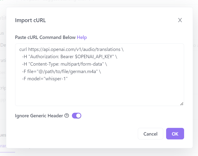 复制 OpenAI 提供的 cURL 代码并粘贴到导入窗口中: