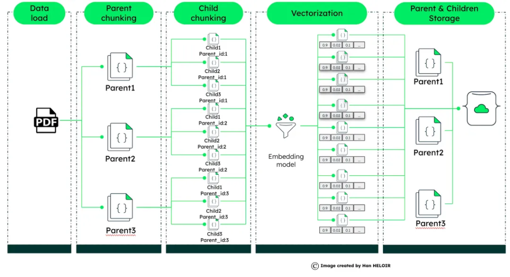 接下来,我们将重点处理作为数据源的PDF文档。文档被加载并拆分为“父”和“子”块,以准备嵌入和向量化。