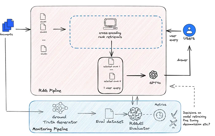 下图是pipeline的架构图,用户查询和文档作为 RAG 管道的输入源,文档子集可用于自动生成用于模型监控的 Ground Truth 数据集。此外,人类标签也可以包含在精选的 Ground Truth 数据集中。