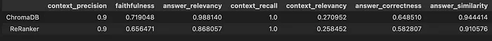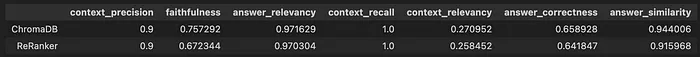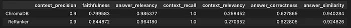 我运行了该流程 3 次,指标各不相同,尤其是在第二次运行中,它显示 ChromaDB 中的忠实度和 ReRanker 中的答案相关性等指标存在显著变化。然而,总体排名保持不变。ChromaDB 的整体表现优于 ReRanker。