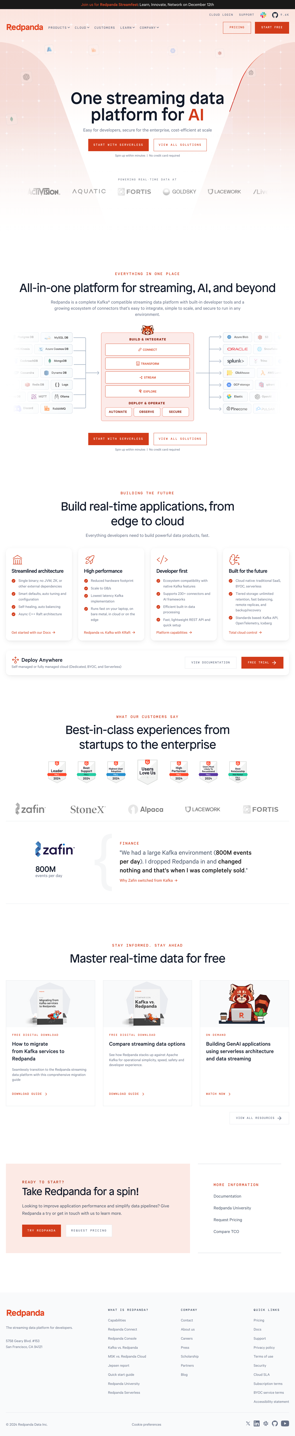 更多Redpanda是一个为开发者设计的流数据平台,提供实时分析和人工智能服务。它兼容Kafka®,拥有260+连接器,支持配置驱动的扩展性连接处理器和内部转换,以及高性能的Kafka服务。Redpanda易于集成、简单扩展,且在任何环境中都能安全运行,支持从边缘到云端的实时应用构建。